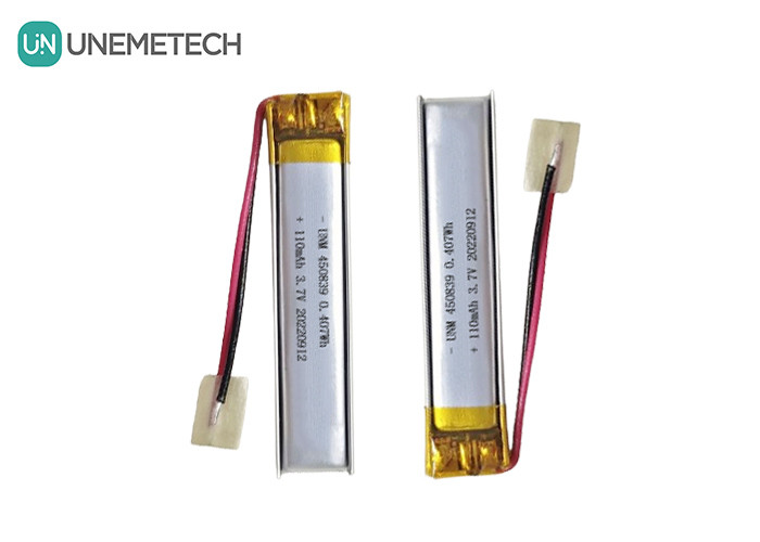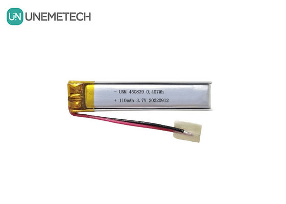精密なデザイン 3.7V 110mAh リポ電池 モデル番号 450839のリッチャージ可能なリチウムポリマー電池は,コンパクトサイズと軽量設計で知られる特殊なエネルギー貯蔵ソリューションです.